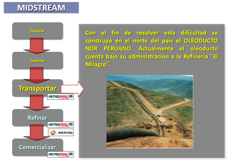 En el caso de Perú, se cuenta con el OLEODUCTO NOR PERUANO de pertenencia del Estado a a través de PETROPERU S.A. que cuenta con estaciones de servicio y unidades de bombeo hasta el terminal Bayóvar que cuenta con patio de tanques de almacenaje y operaciones marítimas para carga y descarga de buques de capacidad AFRAMAX.