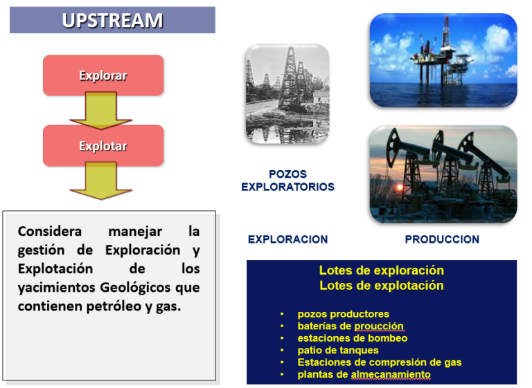 Generalmente se llama UPSTREAM a las operaciones de exploración y explotación de pozos petrolero. Relacionado a firma de contratos sea de concesión o de licencia con empresas especializadas y el Estado para permitir realizar exploración de lugares y lograr éxito en las metas de producir petróleo y/o gas.